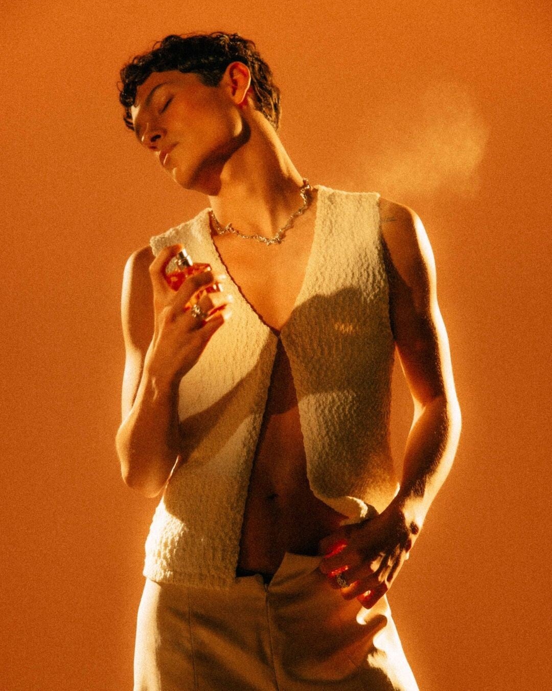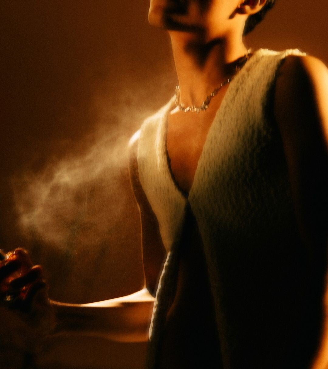 The fragrance is described as warm, fresh, and "a little bit sexy," leaning into a Mediterranean citrus and woody aesthetic.